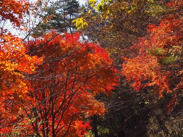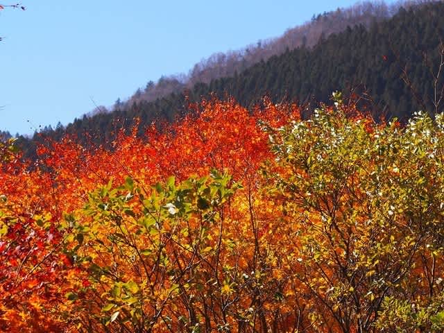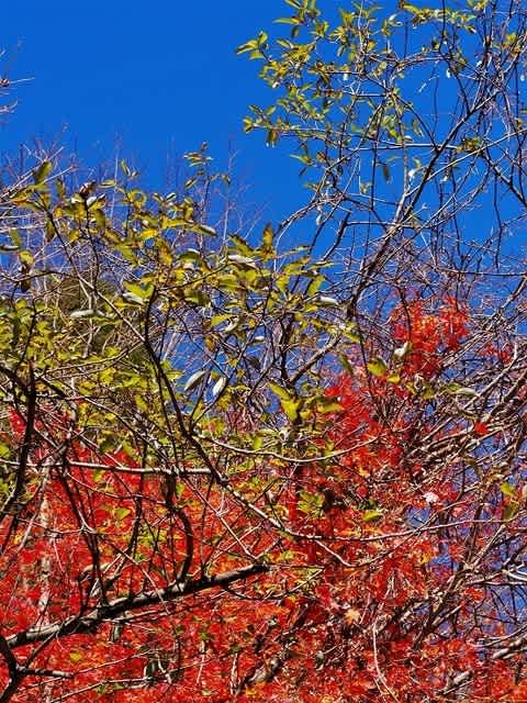 天気予報もよい今日は林道沿いの紅葉が綺麗だという「烏帽子山」登りに行っていました。健脚の中に混じって歩いたので山と渓谷社の分県ガイドでは所要5時間とあるコースを4時間で歩きました。なので下山が12時25分。朝はガスで紅葉楽しめなかったですが帰路は素晴らしい青空の下で燃えるような赤を見る事ができました。