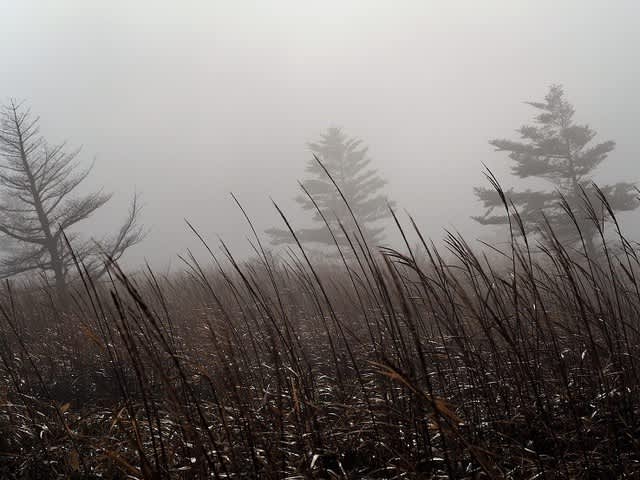 晴れる事を期待しながら雨具(朝露を避けるため)着用して、景色が見えないなか歩く。