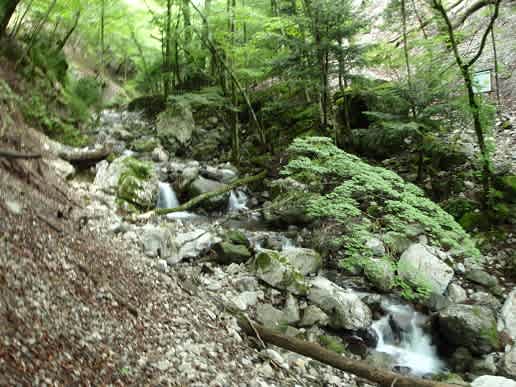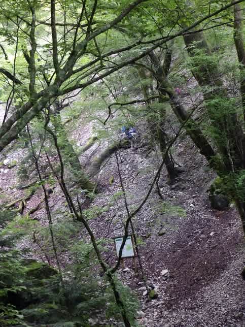 先を行くグループ・・急なザレた道を登っています。ここへ行くのには竜頭谷を渡る必要があります。狭い谷なので梅雨の時期でもあり、雨が続くと渡れなくなる。水・木と天気予報を見て水量が少ないのを予想し金曜日を選んできたのです。