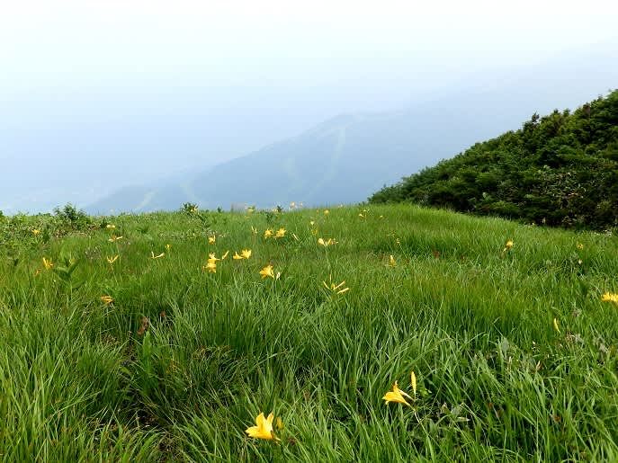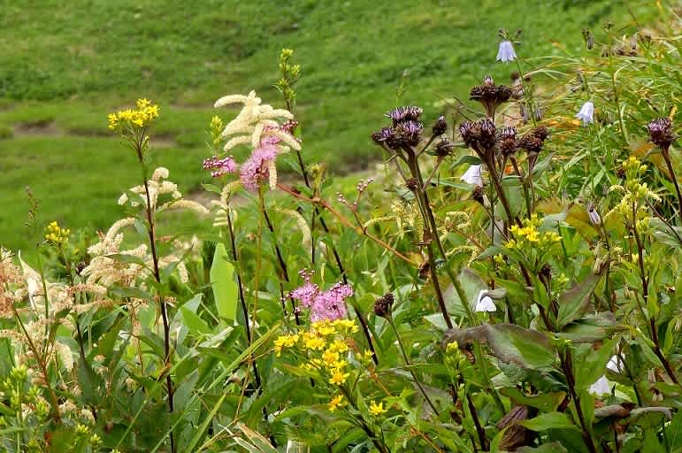 登山路脇で水分多い場所があり、その周辺はお花畑になっていてミヤマアキノキリンソウの黄色。クロトウヒレンの個性的な茎色・渋みのある藤色が映えていました。