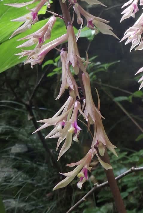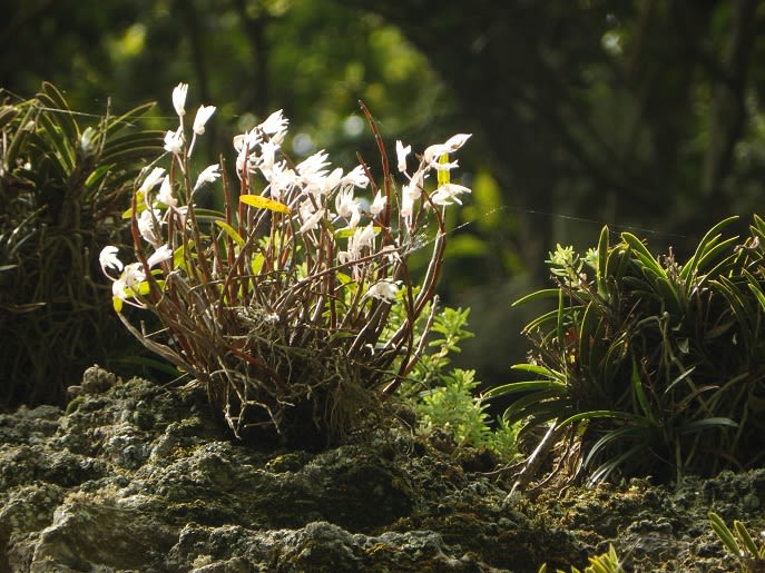 遊歩道を歩いていたら木の枝ごと落ちた株もあります。岩/木に着いて咲いているのをみたいものですよね。実は自生しているのをみたことがない。ぜひ一度みたい。そして香を胸一杯入れたいと願っているのです。