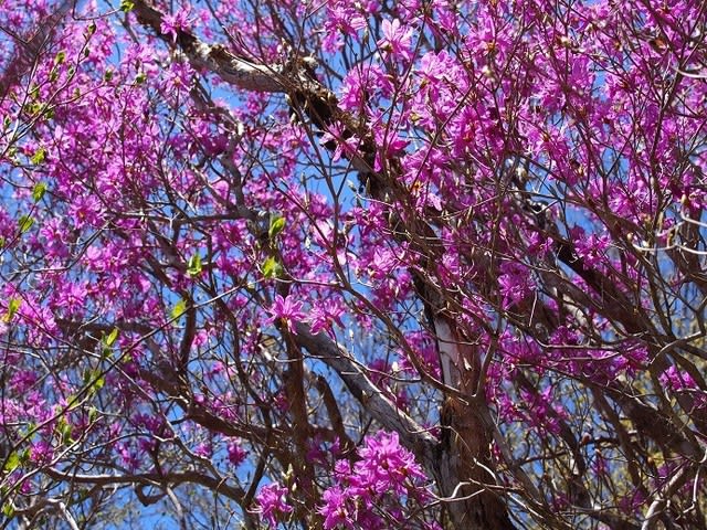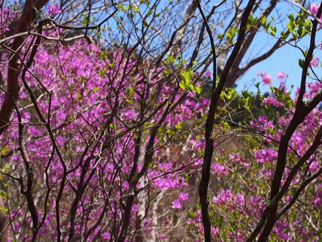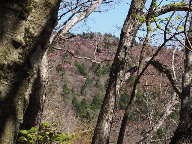 頂上近くまで登ると南斜面はアケボノツツジが美しい。残念ながら手前に木々があり綺麗にみえない。