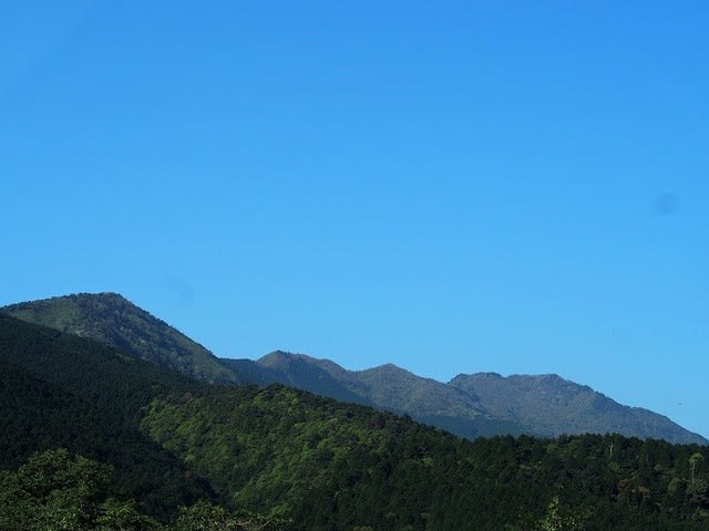 登る山脈を朝一番のトイレ休憩場所からみる。素晴らしい青空。