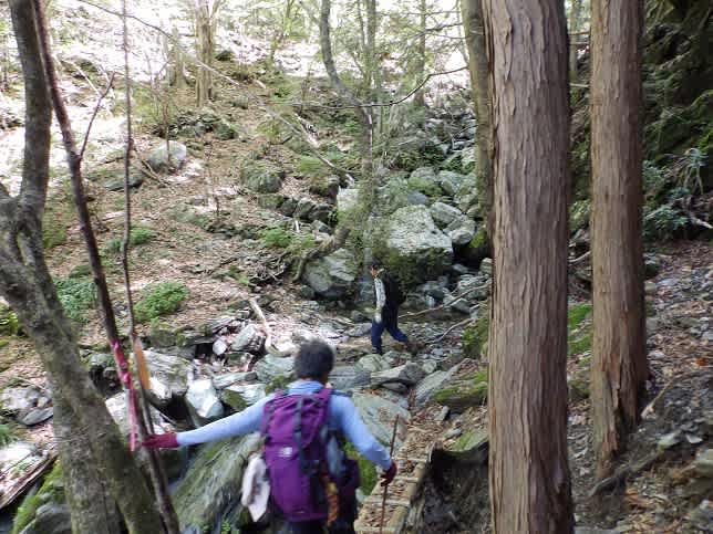 少し、不明瞭な道を歩いてから登山道へ戻り滝壺へ向かう14:06