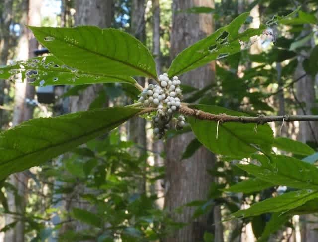 ひとつの果実の直径は2ミリほどと小さいけれど、多数熟すのでムラサキシキブほど人目は引かないが緑の中のこの白、以外と目立つ。