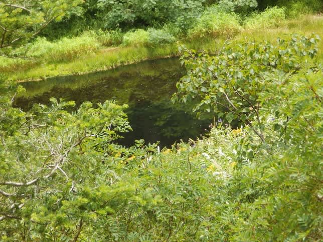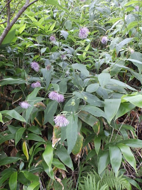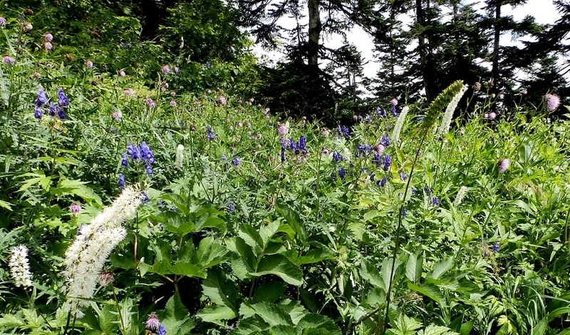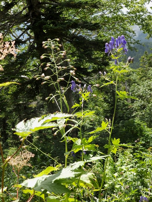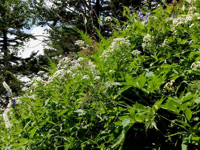右の紫はミヤマトリカブトですが左のキク科は初めて見る花です。コウモリソウのはず。じっくり写したいと思うのですが連れ合いのレーサーの歩きの早いこと、早いこと。なんとなくわかる画像しかうつせませんでした。