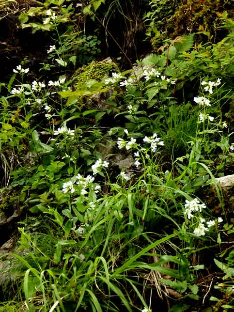 傾斜が急なので鹿も食べに来にくいのでしょうね。かなりの数の株があり白が目立つほどに咲いています。