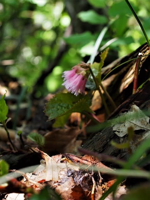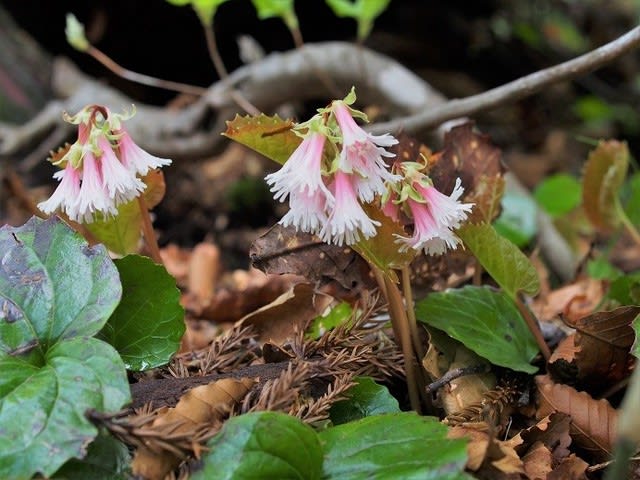 イワウチワ咲く尾根道には葉のみ・・咲き残っていたのは3輪のみ。でも、オオイワカガミがさいていました。