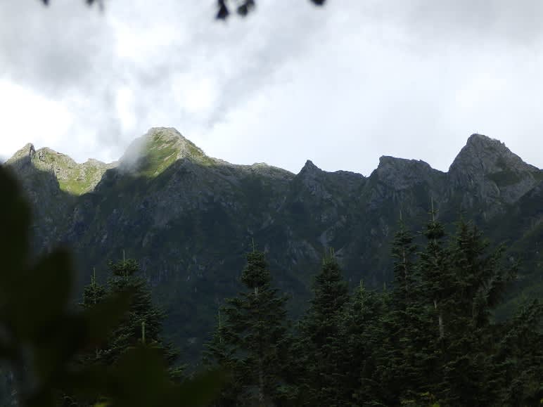 14時40分から山道を歩き始めました。途中展望が開けた場所で運よく登る山並みがくっきりと姿を現しました。とがった岩山が次々と続く。1つ1つ乗り越えたり回り込んだりして行くと「西穂高山」