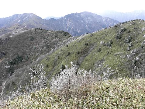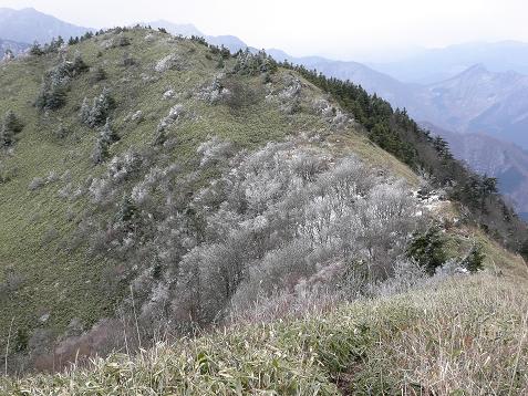 昨日香川からの帰りに見た山にも雪が残っていました。それが溶けずに残りこうしてフクジュソウの周りに積もっていたのです。見てから標高をあげるにつれ霧氷が目に入ってくる。