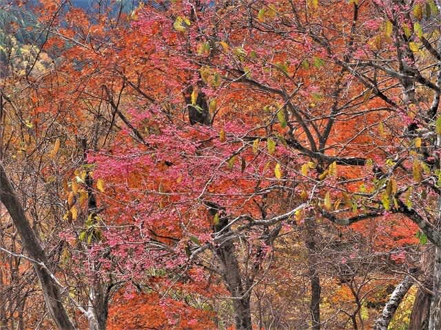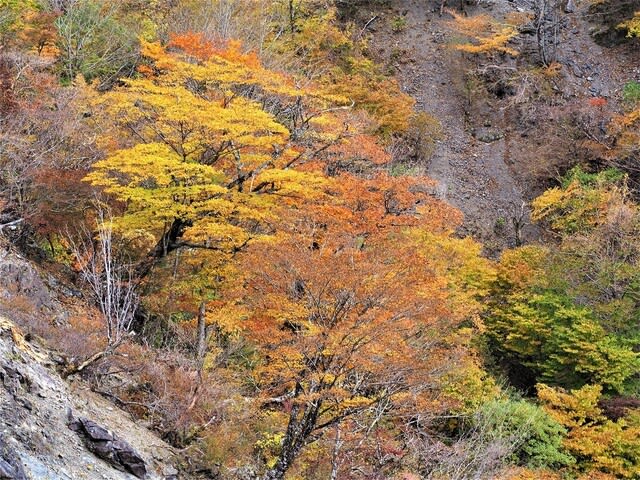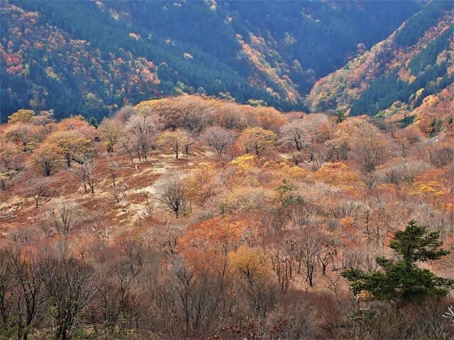 今年はどことも紅葉が良いみたいで、ブナも落葉したのもありましたが葉が多く残っていてその上黄色が綺麗でした。尾根から下りつつみる斜面の色は微妙に違っていて「落葉樹の多い場所はよいな~」と思いながら歩きました。足元はフカフカしてして土が見えない。
