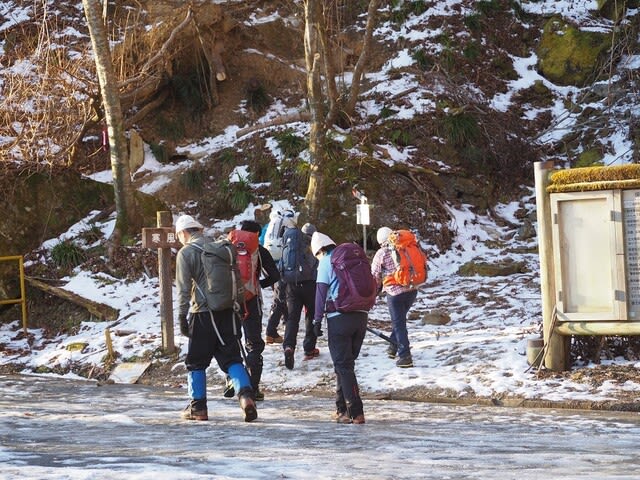 雪はほとんどなし。でも、登り始めるとすぐ凍っていて滑る姿を目撃しました。注意せねばと私たちも続きます。足下注意して登るので夏場なら40分でつく、桑瀬峠まで1時間かかりました。
