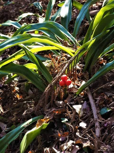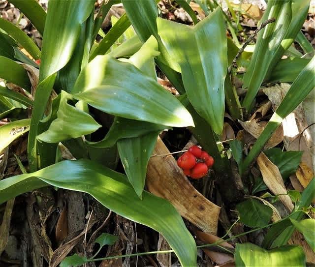 昔から緑の葉と赤い実が珍重されお正月の生け花にもつかわれるこの植物、自生ではさほど赤い実をたくさんつけたのは見られません。今回オモト自体が多かった所為で赤い実が見られ、なんだか縁起がいいな~と思いつつながめました。