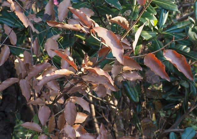ヤマコウバシはクスノキ科の低木。さわやかな香りがあります。それで「山で香ばしい」のが名の由来といわれます。冬の間、葉が枯れても枝についたまま落ちず、4月ごろにはえ替わる。葉が青い時には目立たないのですが、紅葉が始まり、周りの木の葉が落ち始めると、存在感がぐっと増してきます。今回も結構めだちました。