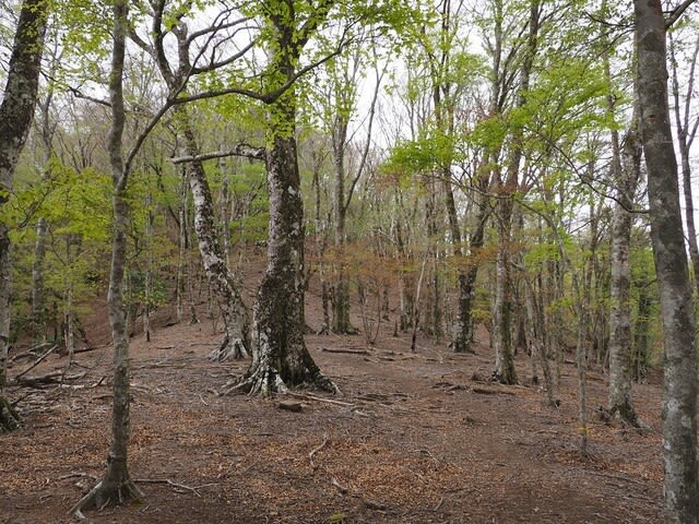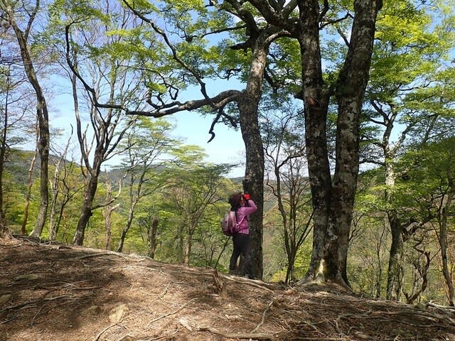 大きなブナにはヤシャビシャクの花・・咲いてから時がたっているので実になりかけているのが見える。撮影している私は小さくみえる大木なのです。