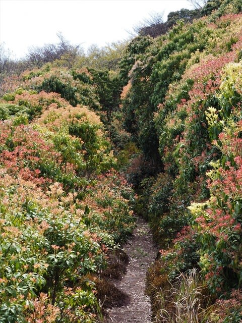 アセビの新葉のトンネル道・・これを抜けて少し行くとシャクナゲ群れ咲く尾根です。